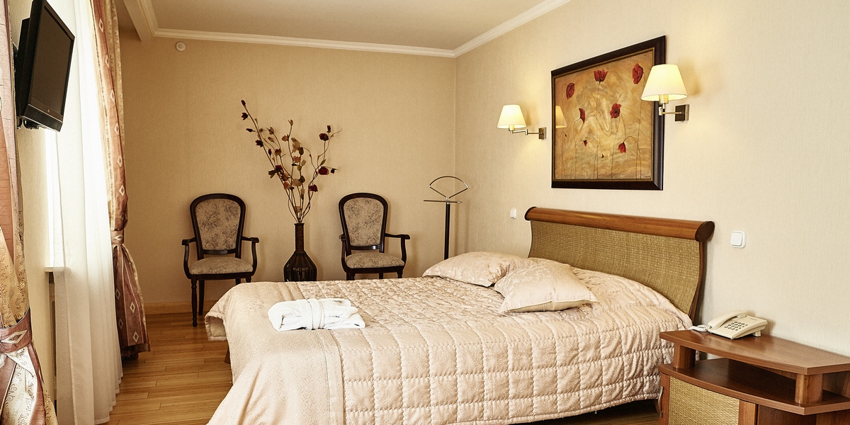У номері: дві спальні в кожній з яких двоспальне ліжко (1600*2000), 2 тумби ліжка, столик косметичний з дзеркалом, телевізор, супутникове ТБ, телефон, вітальня з диваном та двома кріслами, журнальний стіл, телевізор з плазмовим екраном (супутникове ТБ), міні -бар, сейф, фен, доступ до Інтернету WI-FI, велика шафа, холодильник, кондиціонер, банні халати, капці, набір міні-косметики, ванна кімната з великою душовою кабіною, дзеркало для макіяжу.