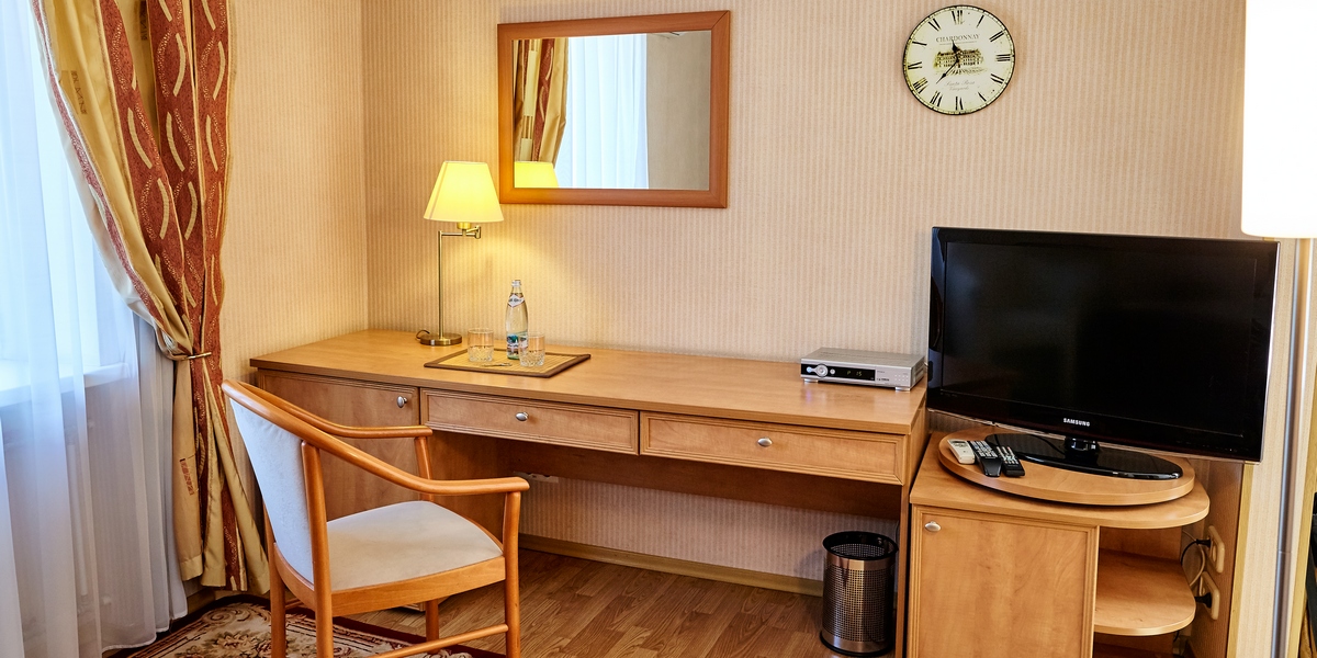 У номері:одне двоспальне ліжко (1400*2000 або 1600*2000), міні-бар, сейф, фен, телевізор із плазмовим екраном (супутникове ТБ), доступ до Інтернету WI-FI, телефон, робочий стіл, тумба під багаж, шафа, два крісла, журнальний столик, холодильник, кондиціонер, ванна кімната з душовою кабіною, комплект мінікосметики, дзеркало для макіяжу.