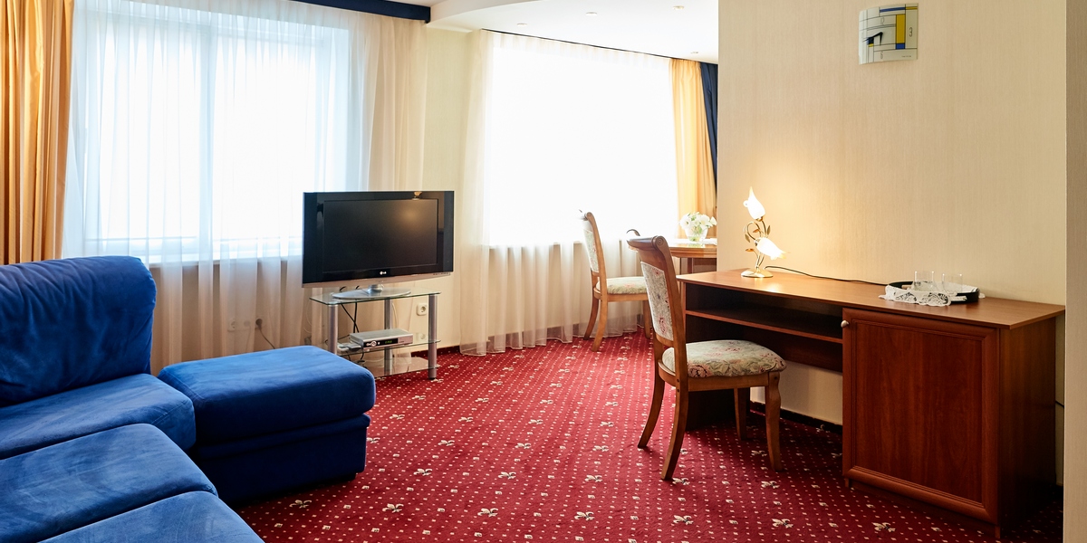 В номере:1 двоспальне ліжко (1600*2000), 2 тумби ліжка, столик косметичний з дзеркалом, банкетка, робочий стіл, тумба під багаж, диван великий кутовий, стіл великий круглий, стільці, гірка з посудом, шафа, міні-бар, сейф, фен, телевізор із плазмовим екраном (супутникове ТБ), доступ до Інтернету WI-FI, телефон, холодильник, кондиціонер, банний халат, тапочки, набір міні-косметики, ванна кімната з великою душовою кабіною, дзеркало для макіяжу.