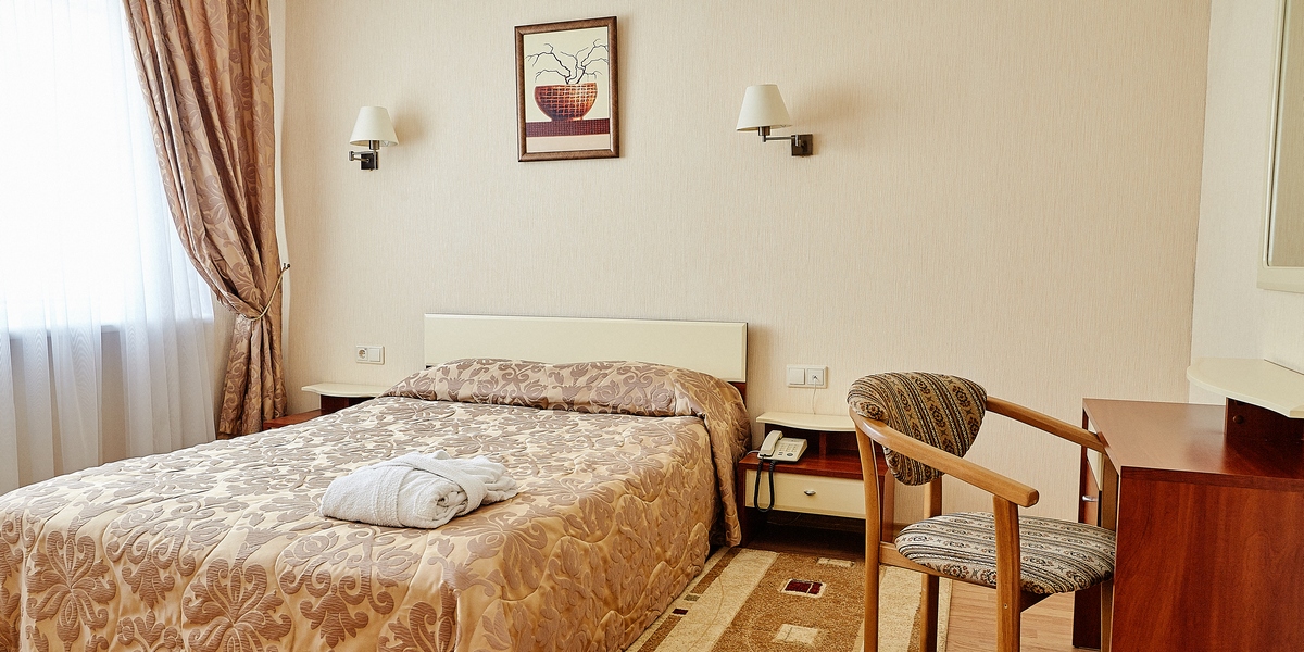У номері:1 двоспальне ліжко (1400*2000), 2 тумби ліжка, міні-бар, сейф, фен, телевізор з плазмовим екраном (супутникове ТБ), доступ до Інтернету WI-FI, телефон, робочий стіл, тумба під багаж, диван, журнальний столик , шафа, холодильник, кондиціонер, банний халат, капці, набір мінікосметики, ванна кімната з ванною, дзеркало для макіяжу.